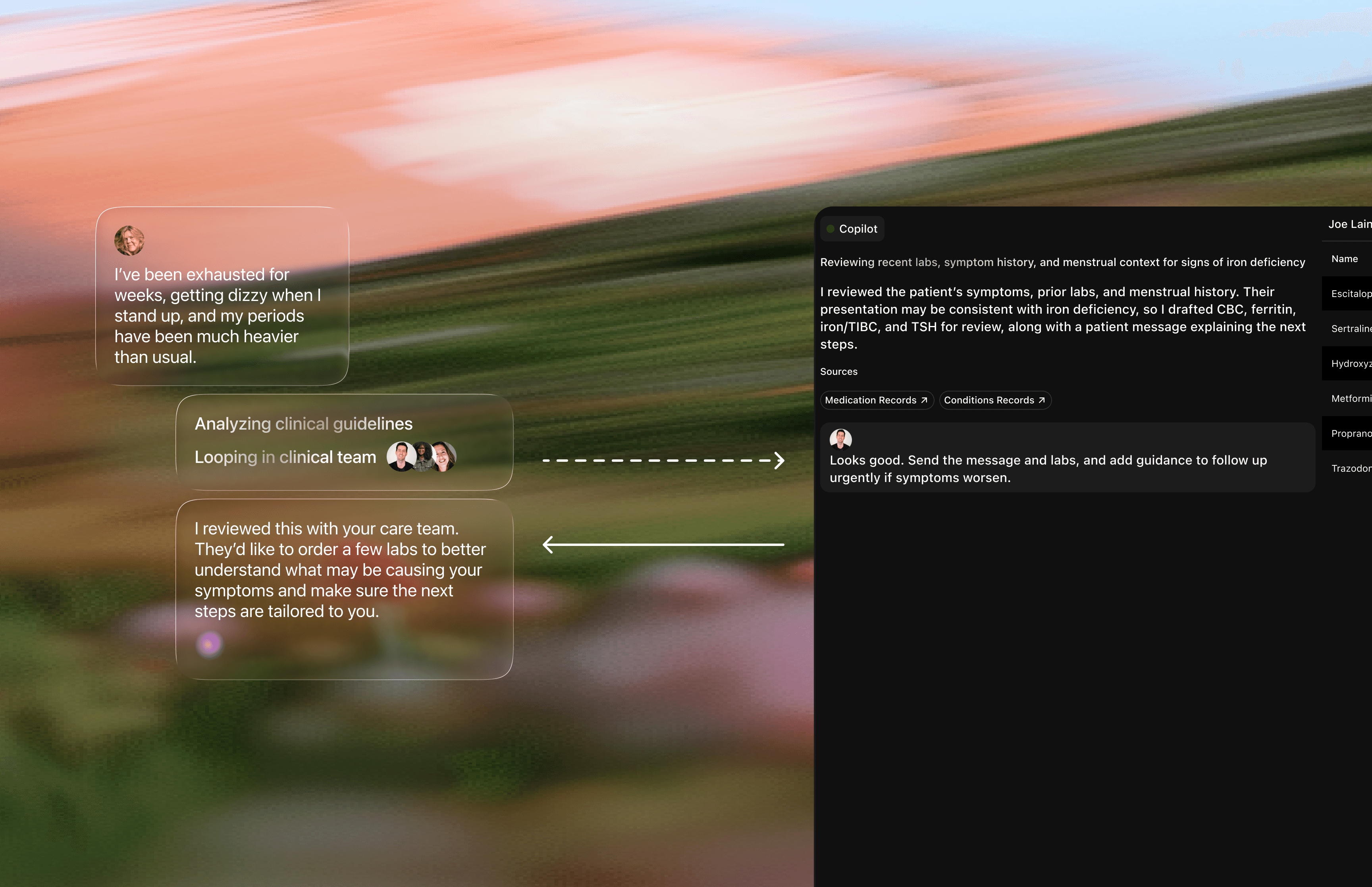 Copilot works with you to understand the whole patient, draft clinical actions for review, and coordinate next steps so you can spend less time on busywork and more time on care.
